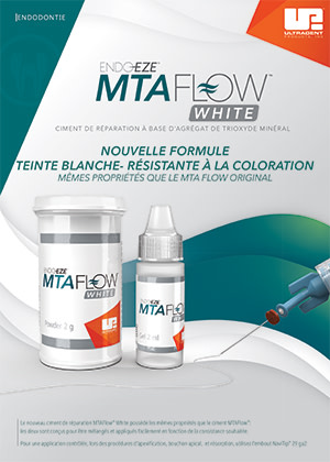 DISPOSITIF MEDICAL pour soins dentaires, réservé aux professionnels de l’art dentaire. Lire attentivement les instructions figurant dans la notice ou sur l’étiquetage avant toute utilisation. Endo-Eze MTA Flow White, destiné à une utilisation en cabinet dentaire uniquement, est une solution antibactérienne qui accélère la réparation des tissus et n’est pas remboursé, Classe IIa, certifié TUV Nord, Ultradent Inc.